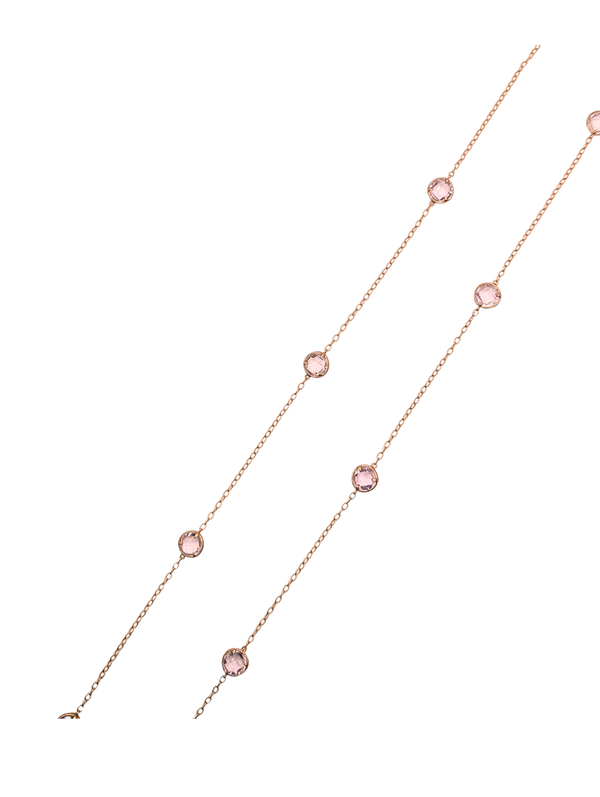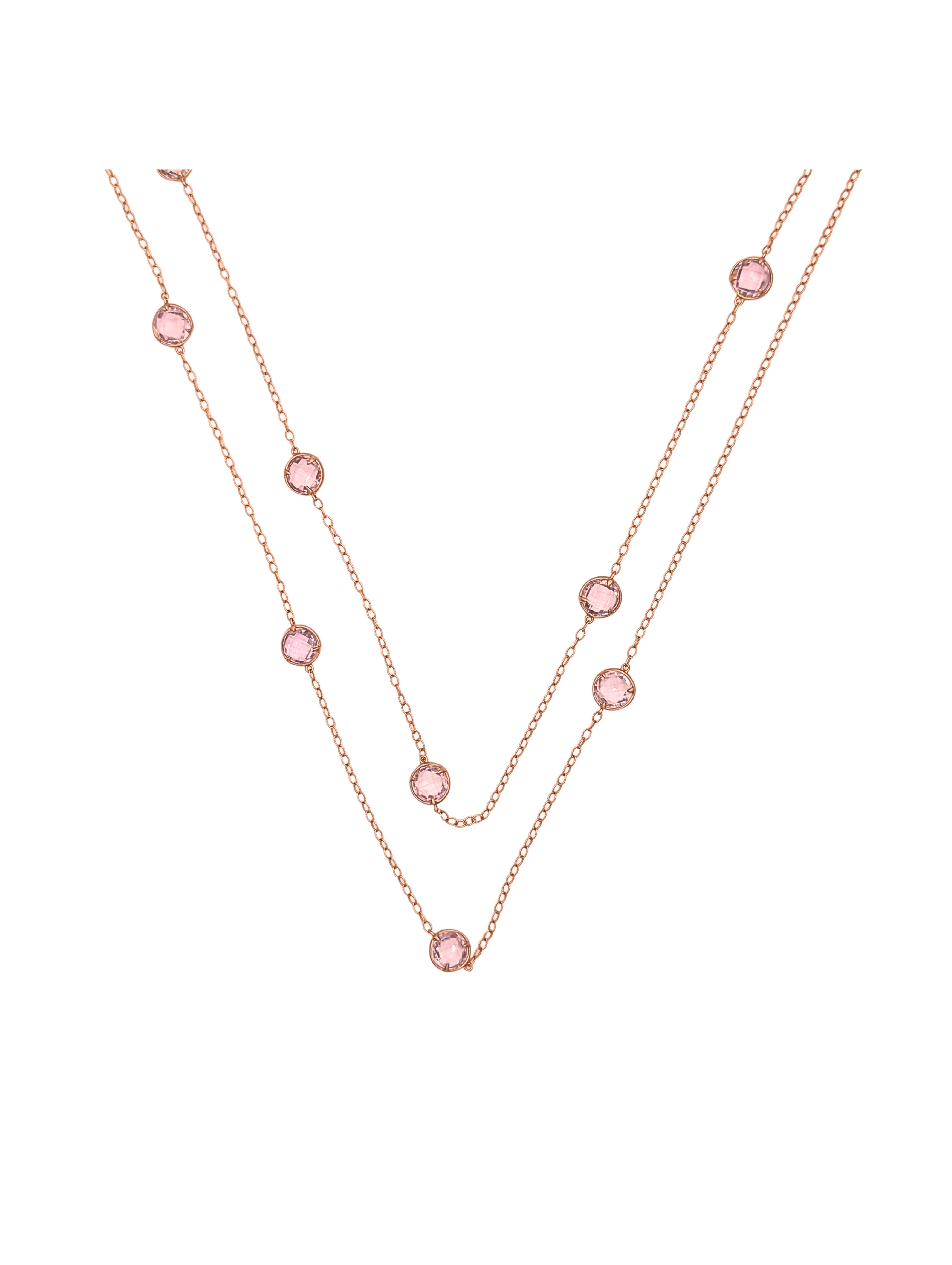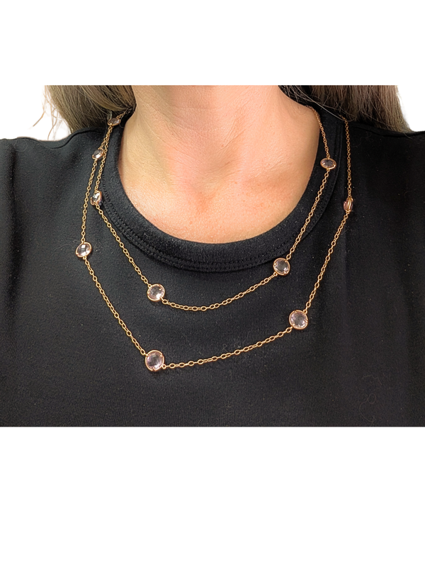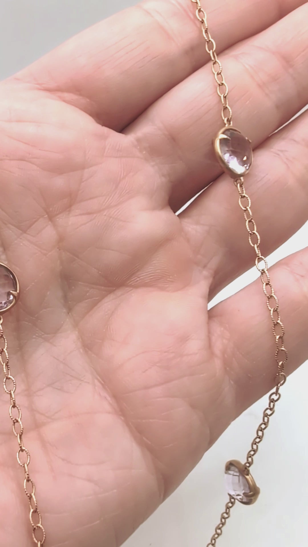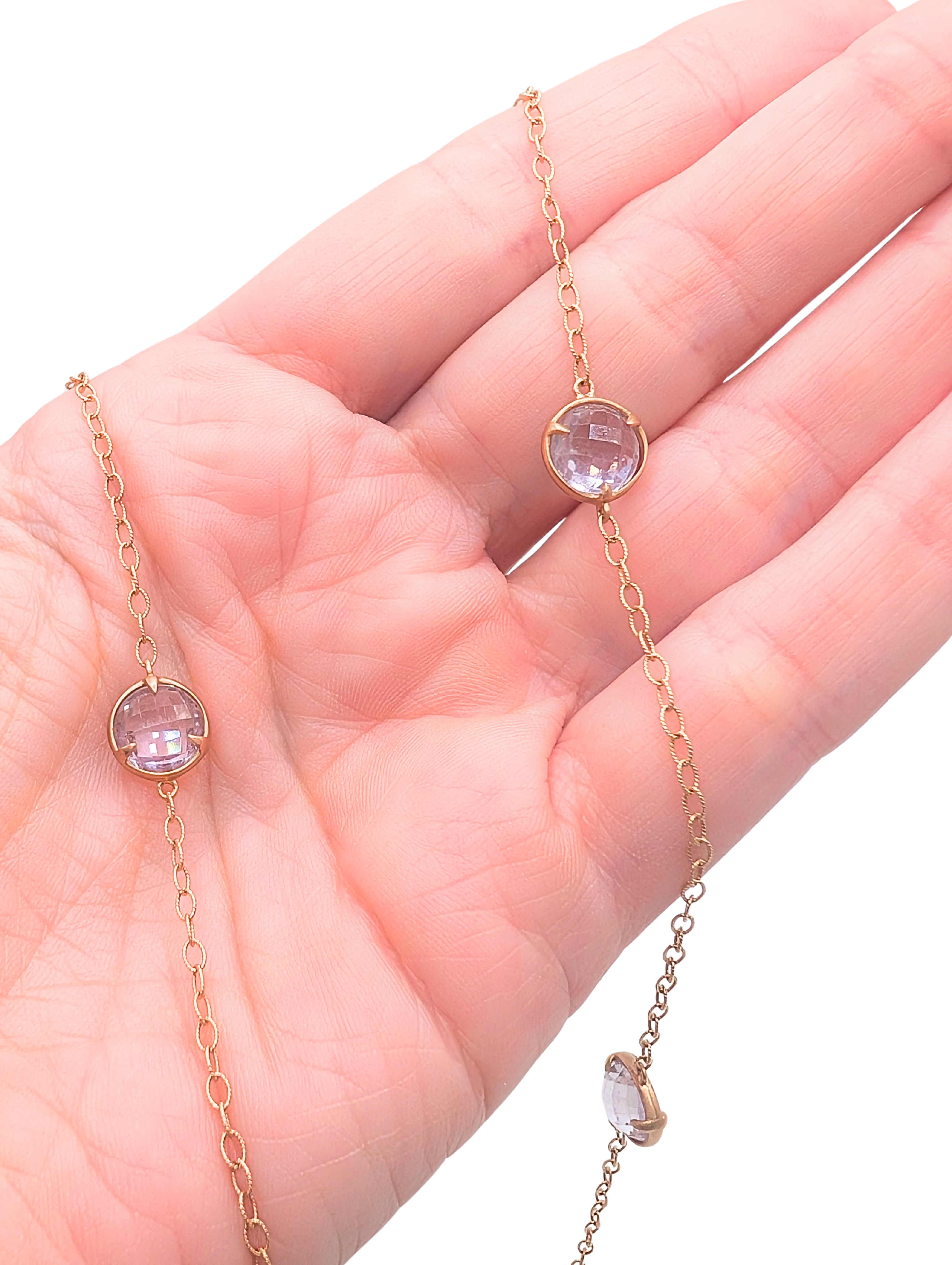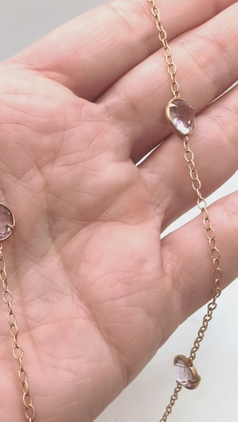 Extra super long amethyst necklace that resembles a giant version of Tiffany's Diamonds by the Yard. The amethysts are faceted on both sides and sit in bezel settings that allow them to flip and turn on the necklace with wear, picking up light and sparkle. The subtle pinkish color is pleasing to the eye and enhanced with the warm 14k yellow gold of the chain. Measures 44" in length. Signed by Carelle. A high-quality piece that's versatile--wear it doubled for a shorter look or long for drama.