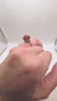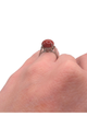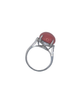 Art Deco platinum and diamond ring featuring a round cabochon cut coral in the center. The coral is a deep orange color that is perfectly contrasted with the white diamonds on the sides and profile of the ring. Dramatic claw prongs hold it in place, and grab your attention.