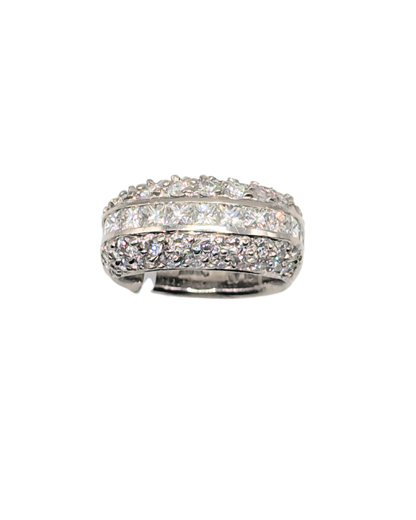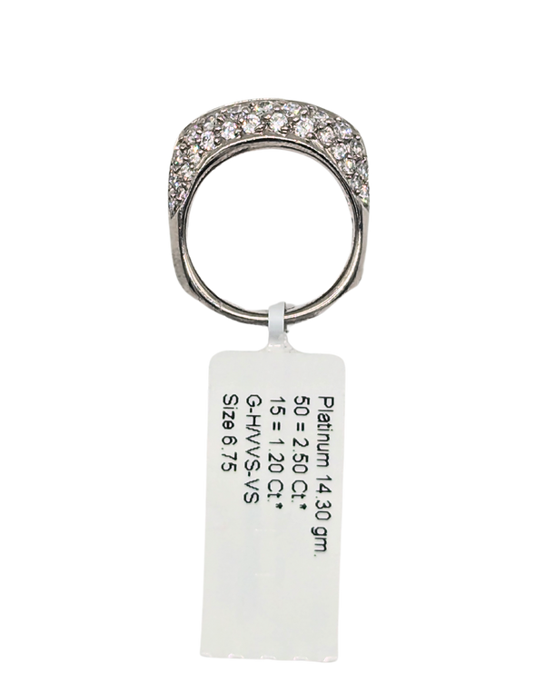 Cushion-shaped ring crafted in platinum. Features 15 square-cut diamonds (1.20 ctw) and 50 round pave-set diamonds (2.50 ctw) for a total of 3.70 carats of total diamond weight. All diamonds are G-H color and VVS-VS quality. Diamonds align the top, sides, and profile of this super sparkler.