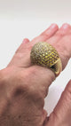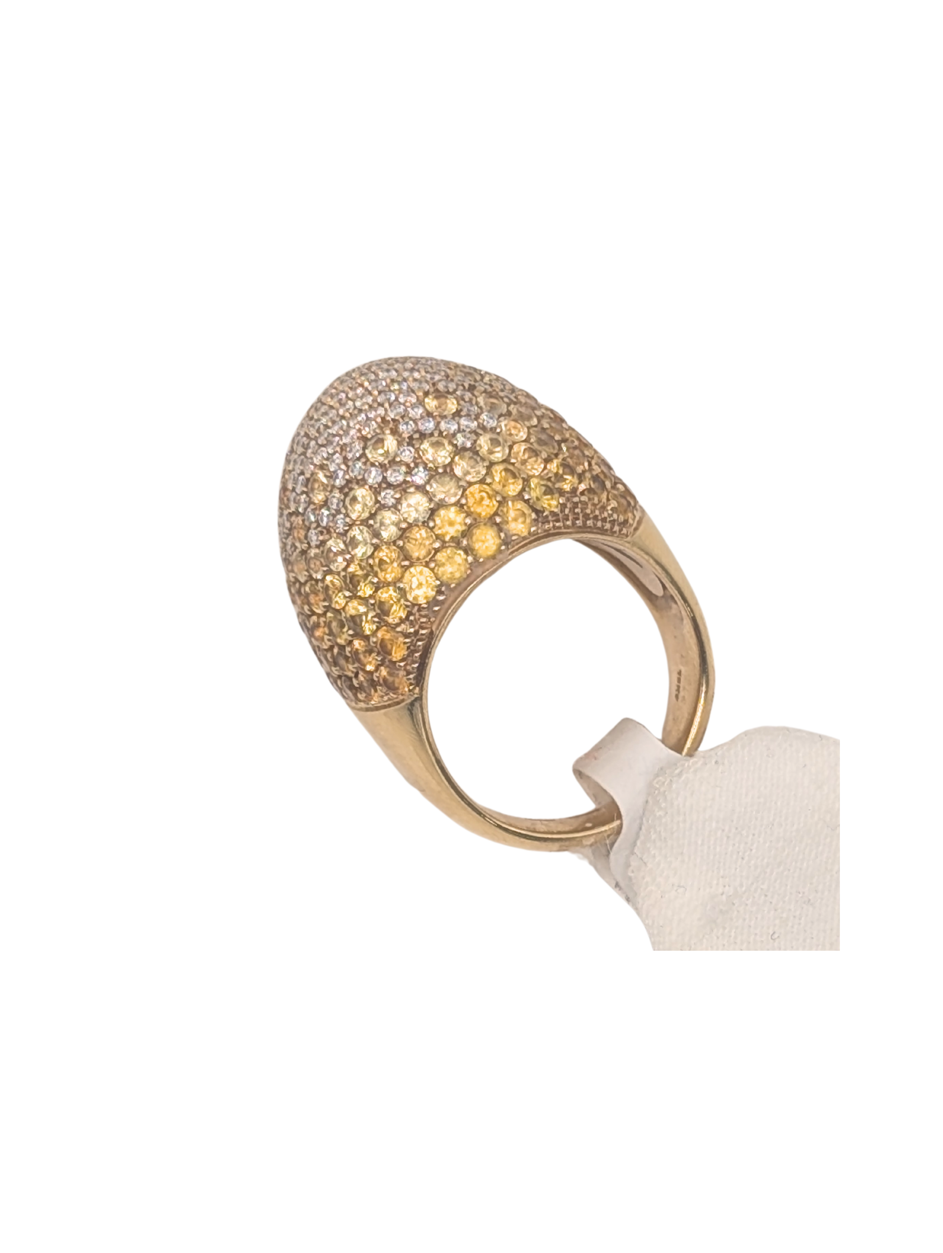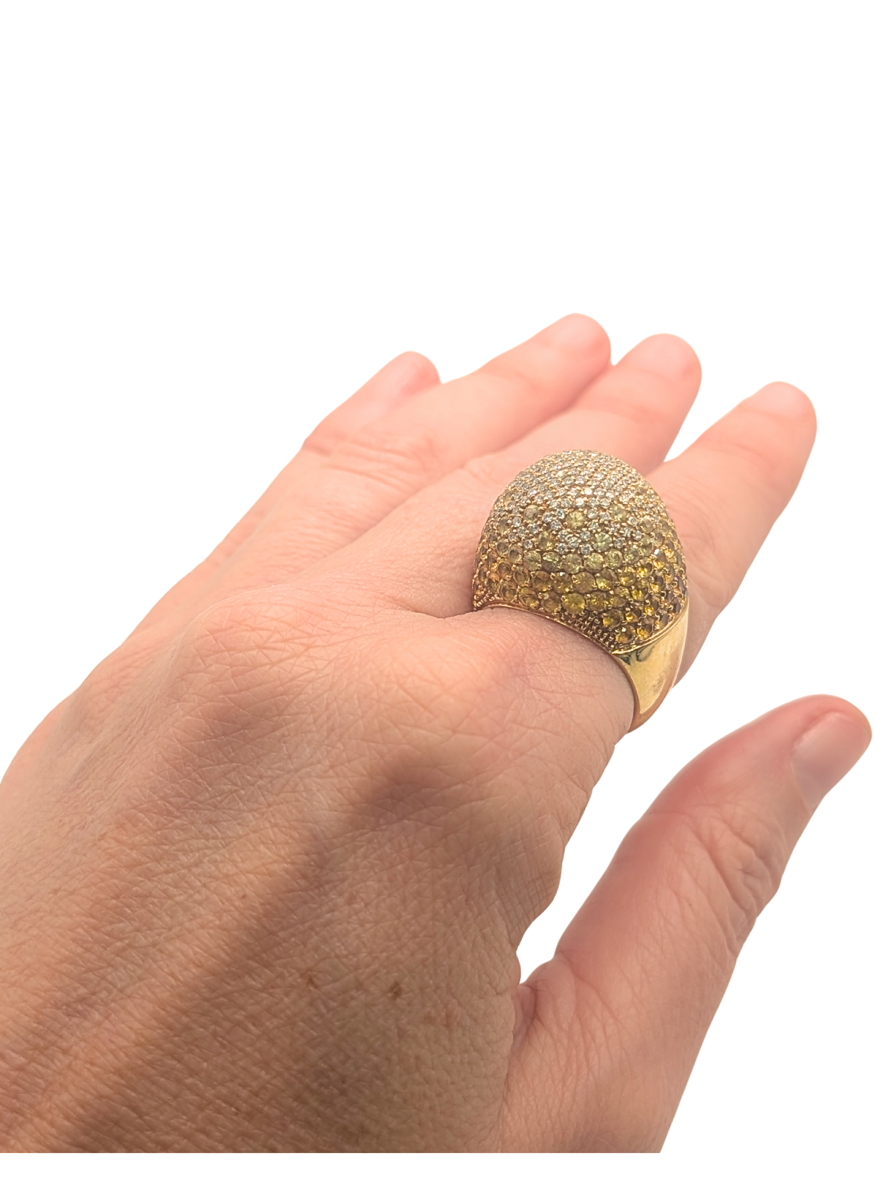 Domed diamond ring with 1.56 carats of yellow and white diamonds set in rich 18k yellow gold. The gradient of the diamonds on the profile of this ring is what makes it so interesting. A massive stunner with shine for days!