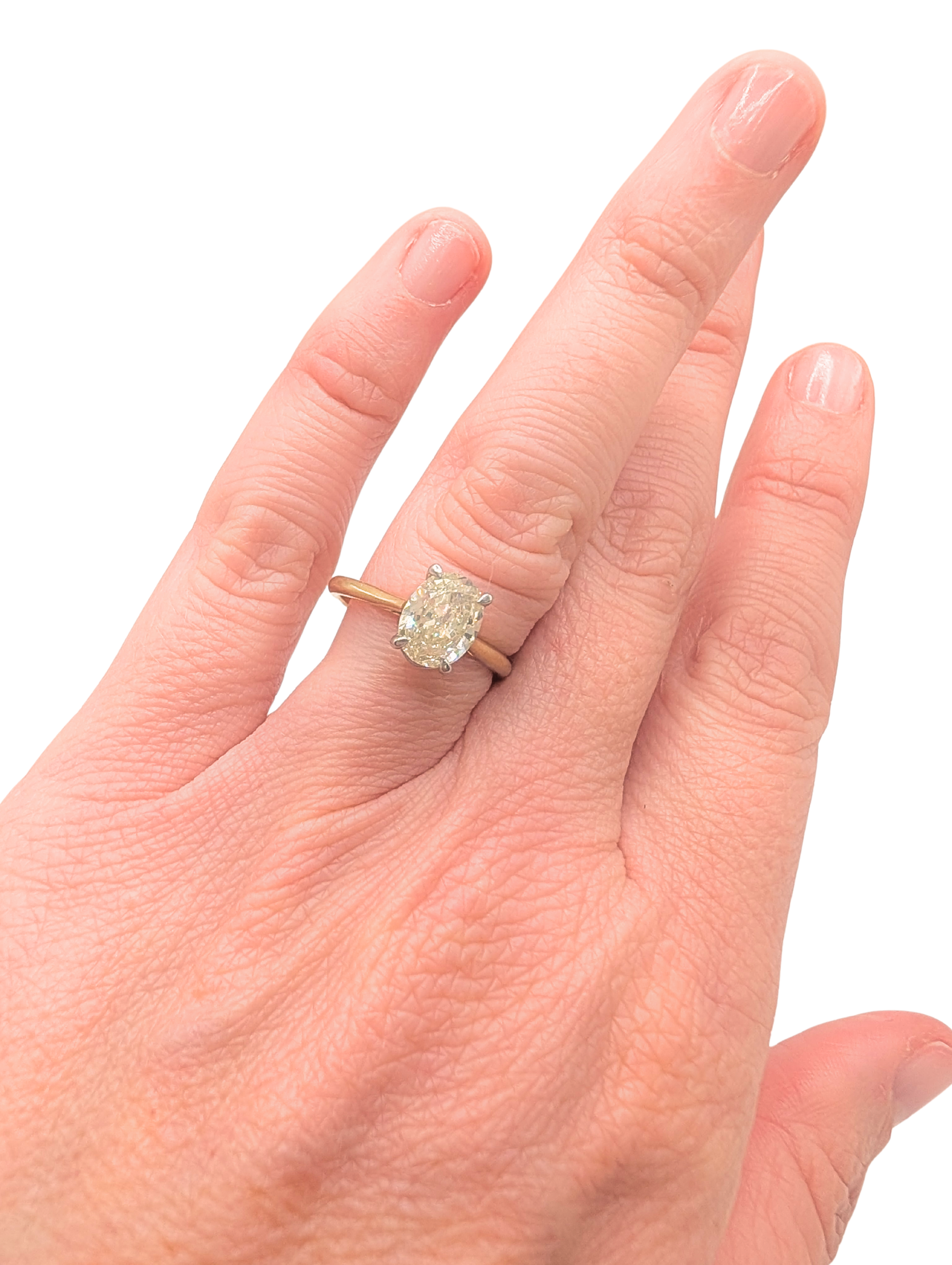 Natural 1.50 carat oval diamond set in 14k yellow gold. This is the perfect ring for those looking to get an oval solitaire engagement ring for a great price because the stone has a bit of color (M), which brings down the price compared with a whiter stone, but the warmth of the color of this particular stone is actually very pleasing. The clarity is good (SI2), and diamond comes with a GIA certificate of authenticity. A really great find!